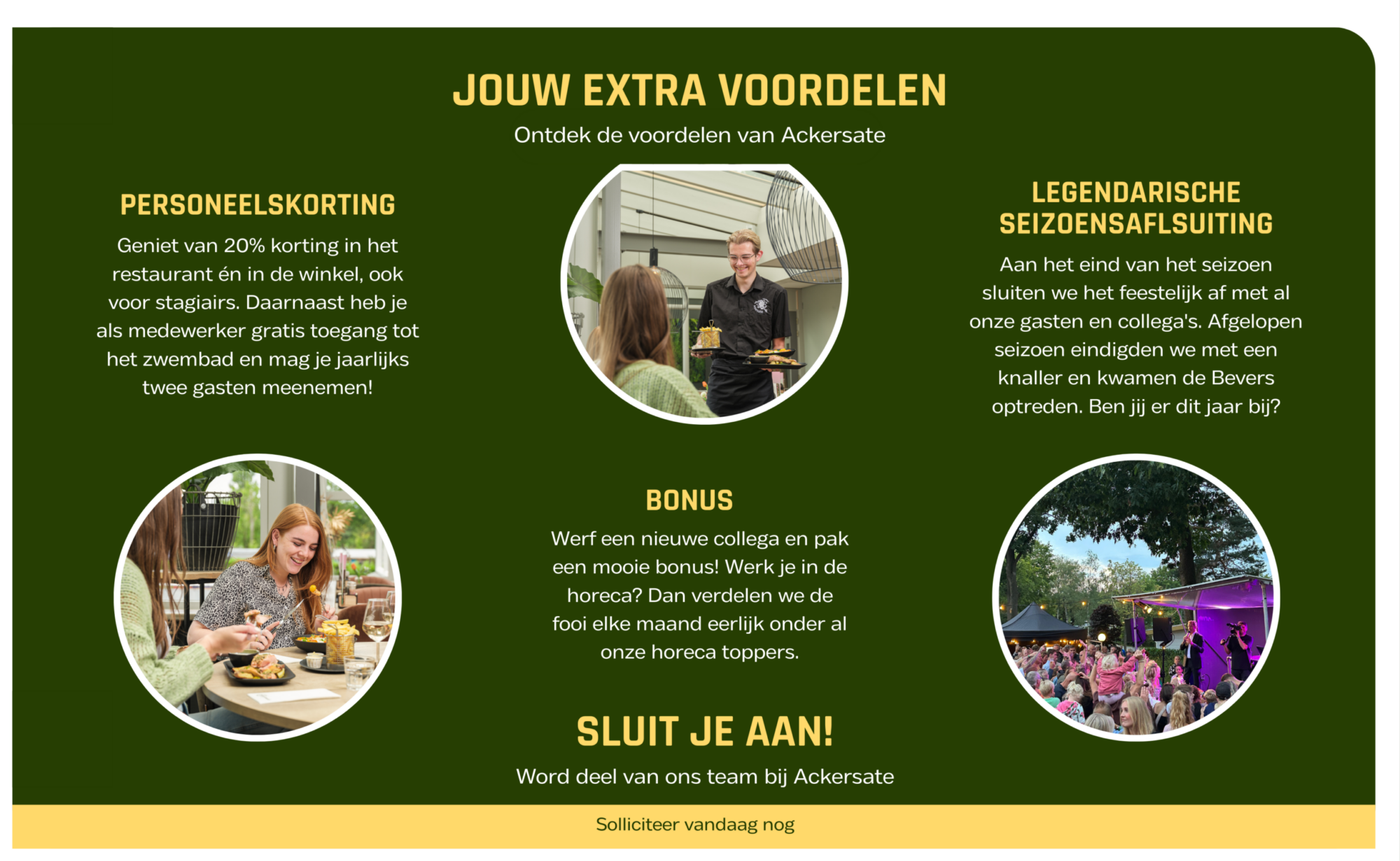 Op Ackersate werken we volgens de cao Recreatie. In deze cao staan afspraken over onder andere salaris, werktijden, pauzes, vakantiedagen en toeslagen. Zo weet je precies wat je rechten en plichten zijn en zorgen we voor eerlijke en duidelijke arbeidsvoorwaarden. Klik hier om meer te weten te komen over de cao Recreatie.